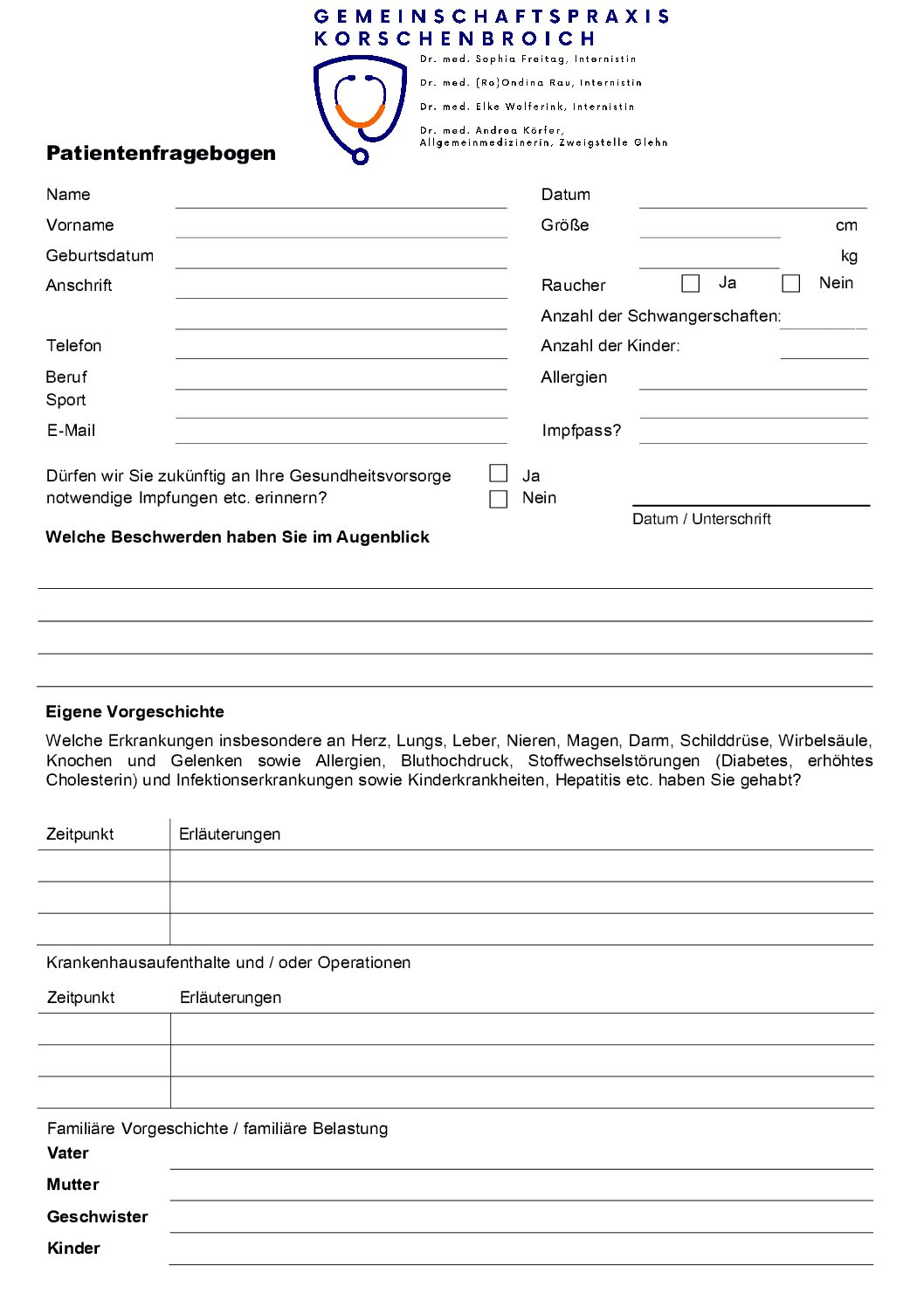 Sie sind schon unser Patient? Auch Sie sind herzlich eingeladen, den Bogen erneut ganz aktuell auszufüllen. Es ändert sich ja in unser aller Leben ständig vieles. Aus diesem Grund sollte die eigene Krankheitsvorgeschichte und die Familienvorgeschichte ständig ergänzt werden.